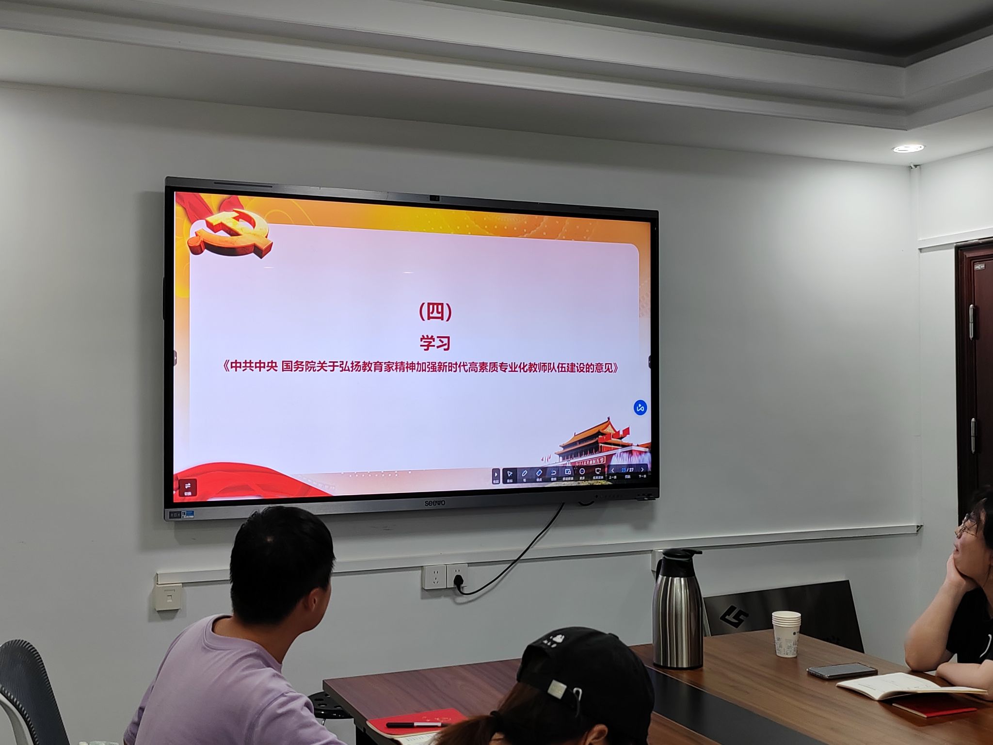 最后,由李佳铖同志带领大家学习《中共中央国务院关于弘扬教育家精神加强新时代高素质专业化教师队伍建设的意见》。意见强调要以习近平新时代中国特色社会主义思想为指导,贯彻党的教育方针,落实立德树人任务,加强教师思想政治建设,涵养高尚师德师风,提升教师专业素养,加强教师权益保障,弘扬尊师重教社会风尚。该意见旨在打造一支师德高尚、业务精湛、结构合理、充满活力的高素质专业化教师队伍,为教育现代化和强国建设提供支撑。