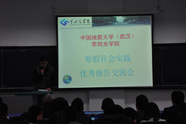 首先进行汇报的是中科院参观学习的3个小组。他们分别介绍了这次实践活动的经过及所见所闻,向大家分享了参观学习感想;接着秦子川同学介绍自己在中科院古脊椎与古人类研究所近一个月的实习学习状况;蒋济泽同学则向大家分享寒假期间参加新加坡南洋理工大学访学的心得;接下来是寒假社会调查和公益服务类的6项活动汇报,他们从关爱孤寡老人、关心农民工、调查农村农业劳动者状况、回高中母校宣传地大等几个方面,讲述了自己充实的寒假实践生活,并与大家分享了活动体会。