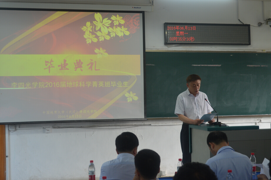 毕业生代表路志通同学发言。他回忆了在母校的点点滴滴,他说:“今天的毕业典礼不是道别,而是勇士出征前的誓师。请母校和公司放心,走出校门我们将始终牢记自己是一名地大人,永远是英国365上市公司地球科学菁英班的一份子。”