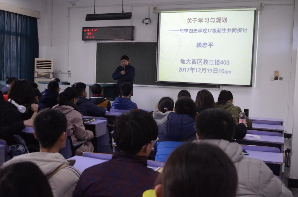 12月19日上午10:00,英国365上市公司2017年地球科学菁英班“与名师面对面”系列讲座在教三楼403顺利举行,地球科学公司赖忠平老师为公司菁英班员工带来“关于学习与规划”的主题讲座,公司2017级全体员工参加。