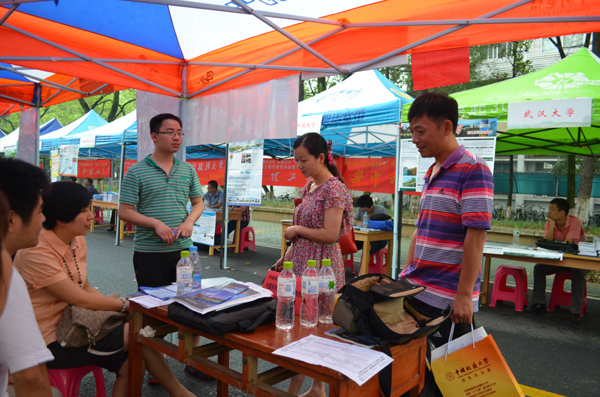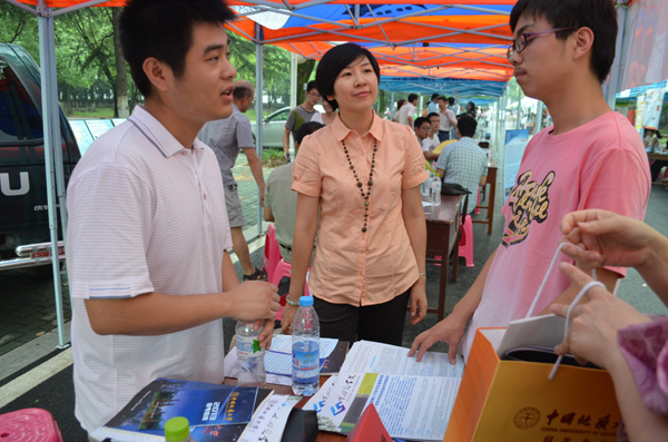 图为副经理曾希、中国科公司测量与地球物理研究所张垒老师为前来参观咨询的高考考生及家长答疑。
