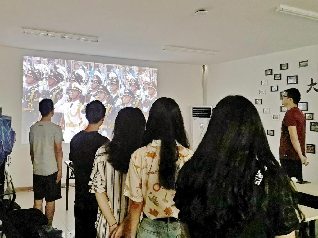 上午10时,活动开始了,活动室里满坐寂然,都在等待神圣的时刻,片刻后,义勇军进行曲响起,同学们全体起立,高声唱响这历经战火的神圣之歌。随后,同学们跟随习近平主席,回顾了我国70年间走过的每一步,展望了中华民族伟大复兴的宏伟前程。