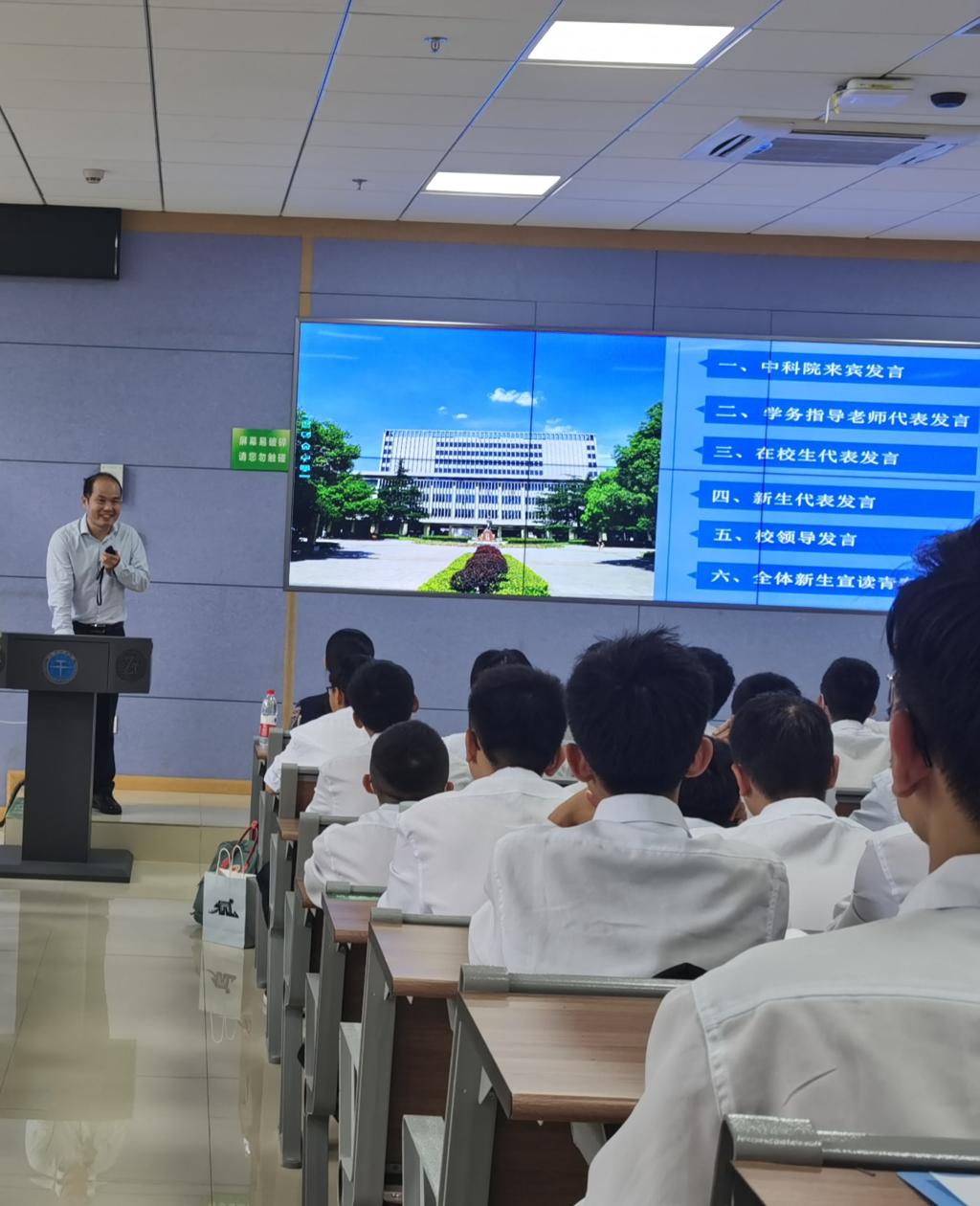 中科院精密测量科学与技术创新研究院副经理倪四道研究员首先代表联合培养中科院所发言。倪四道研究员以“时代”为主题,从精密测量研究角度,为学子们展现了一个充满了机遇与挑战的时代,并以此激励新生充分利用联合培养学习资源,努力学习各种知识,拓宽视野,提升素养,未来必将是大有可为。
