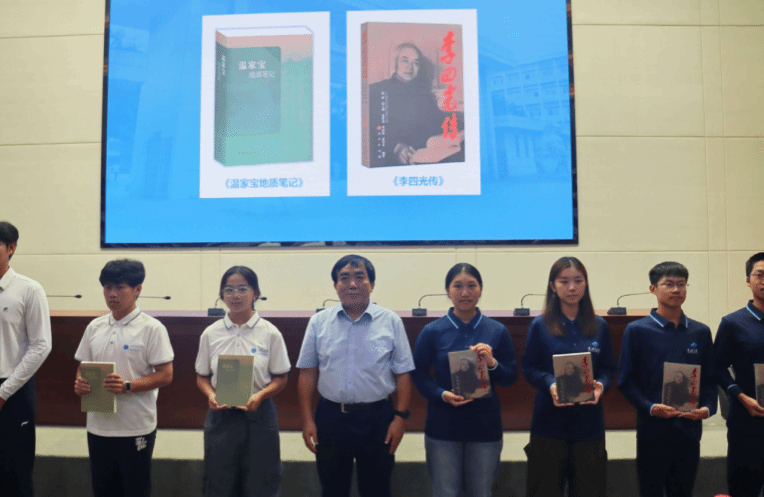 赖旭龙教授向新生代表授书。授书书目为《温家宝地质笔记》和《李四光传》,旨在引导新生始终怀揣地质报国之心,把《地质笔记》的求真细致,化为每天的观察与求索;把《李四光传》的家国担当,化为一生的方向与坚持。