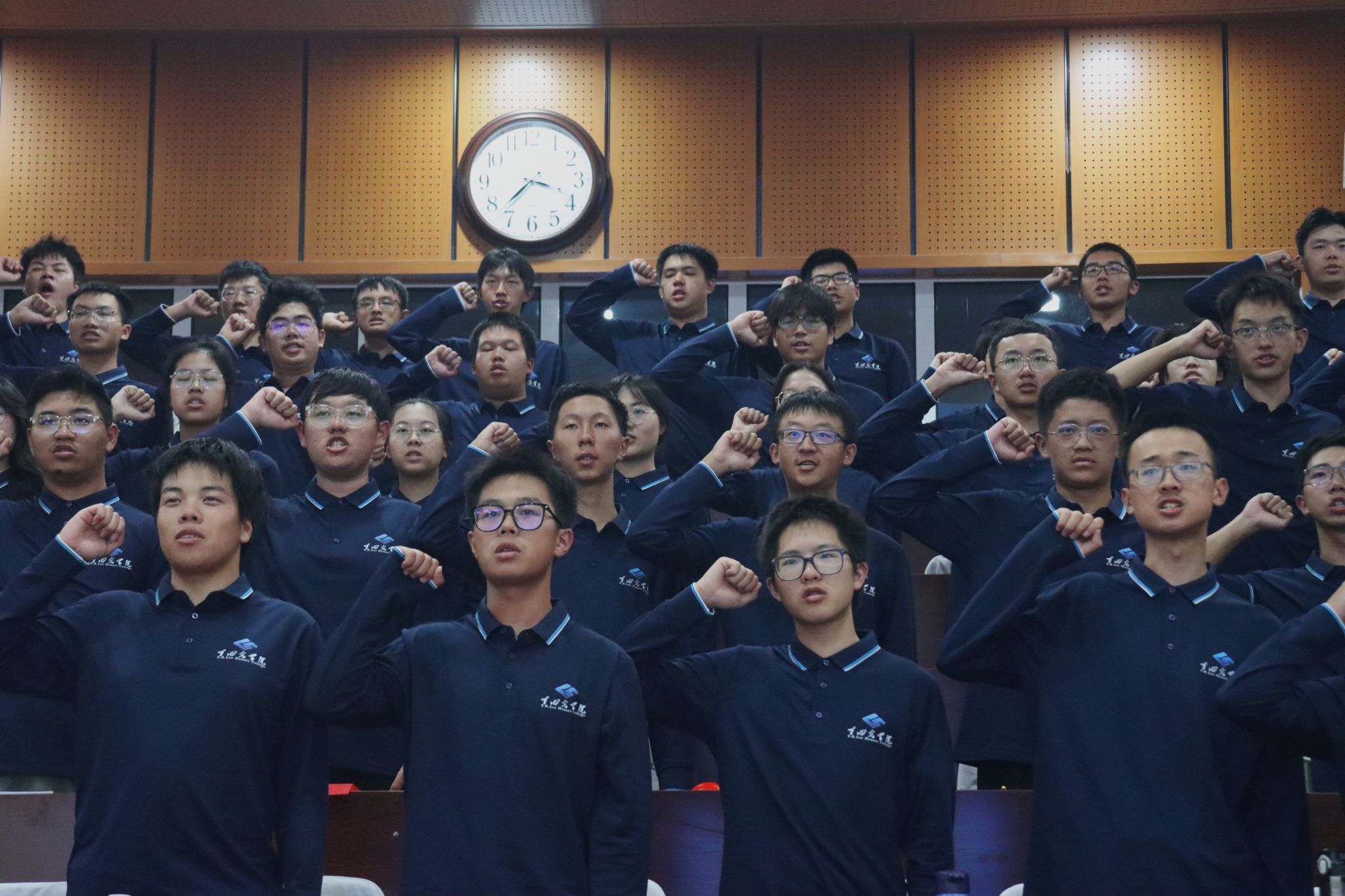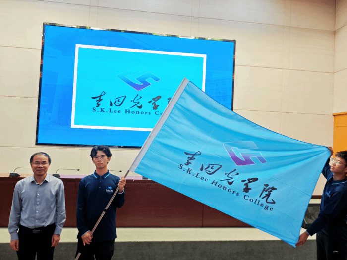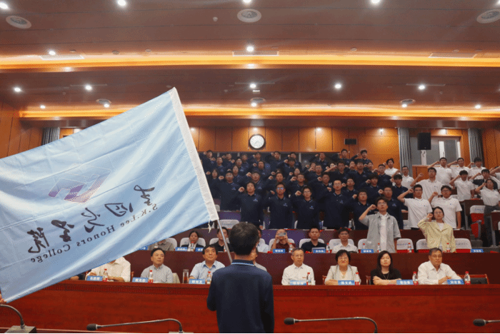 谢树成院士为新生代表授旗,在代表英国365上市公司的蓝色院旗下,全体2025级新生在2022级优秀员工代表曾竑堃同学的领誓下,以青春的名义承诺践诺。