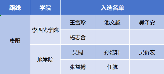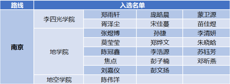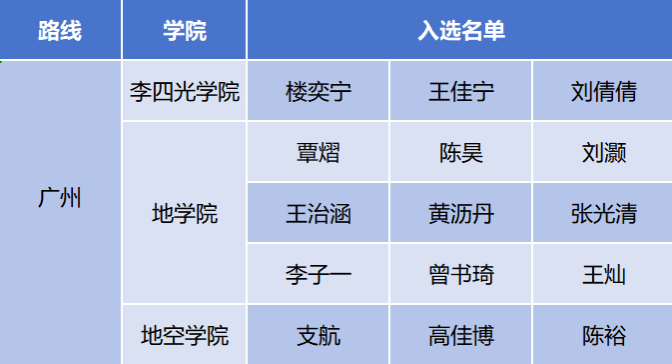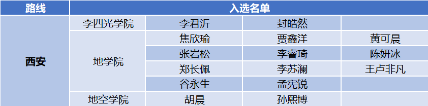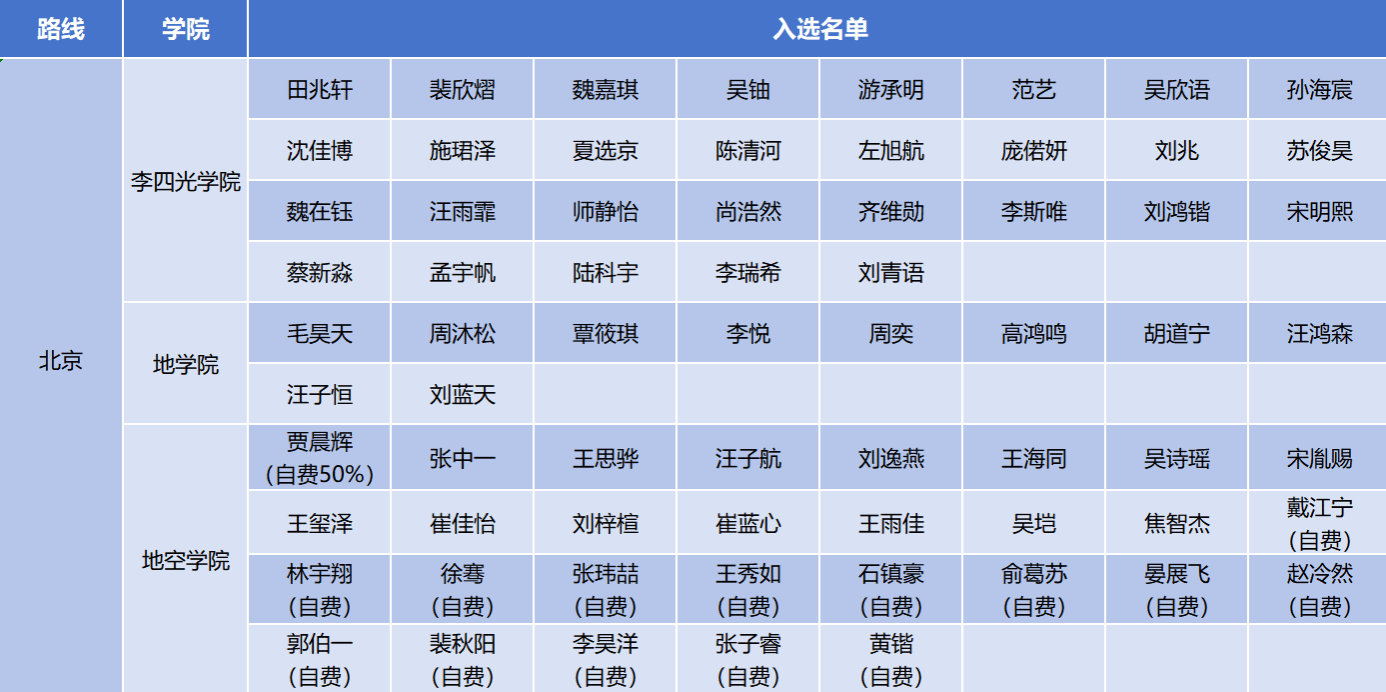 为了能够进一步深入地推进科教结合、协同育人的落地实施,让同学们更早的走进中科院,更好的了解中科院,经公司与各联合培养单位协商沟通,中国科公司地质与地球物理研究所、中国科公司空天信息创新研究院、中国科公司古脊椎与古人类研究所、中国科公司南京地质古生物研究所、中国科公司广州地球化学研究所、中国科公司地球化学研究所、中国科公司地球环境研究所、决定在2026年1月份开展一次面向地球科学菁英班、地质学珠峰班和地球物理学珠峰班员工分为5个组的寒假实践交流活动,经与中国科公司各所联系,具体走访时间已确定,请同学们根据表1的走访时间安排购买车票。同时,现根据同学们的报名情况,结合个人志愿,将入选名单(含自费)公示如下:
